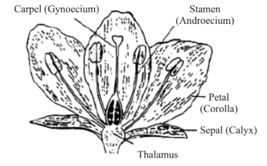 41. Draw a neat diagram of a typical bisexual dicotyledonous flower and label its four whorls (parts):